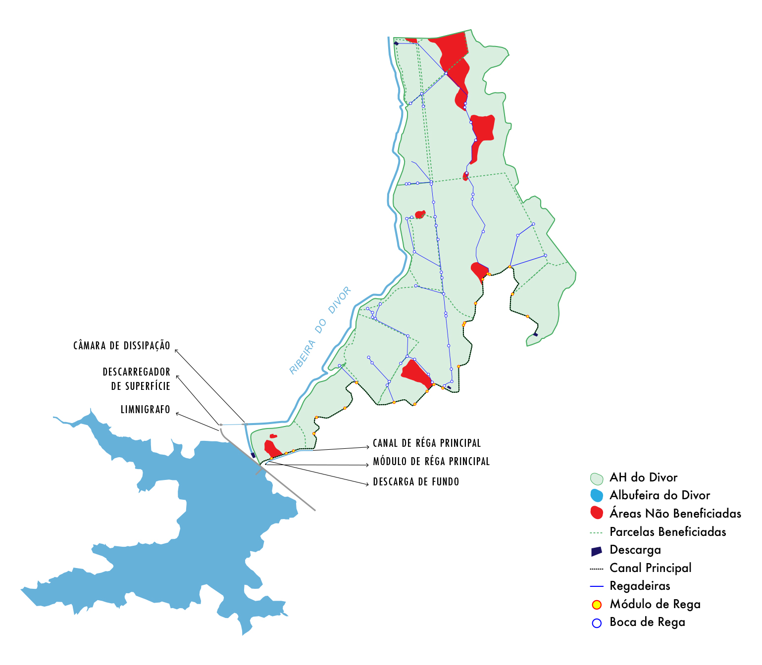 A área beneficiada do Aproveitamento Hidroagrícola do Divor, integra uma área de 488 ha. Os solos regados deste aproveitamento são predominantemente mediterrâneos (cerca de 90%). Como ocupação cultural realçamos as seguintes culturas: olival, milho, arroz e culturas forrageiras.